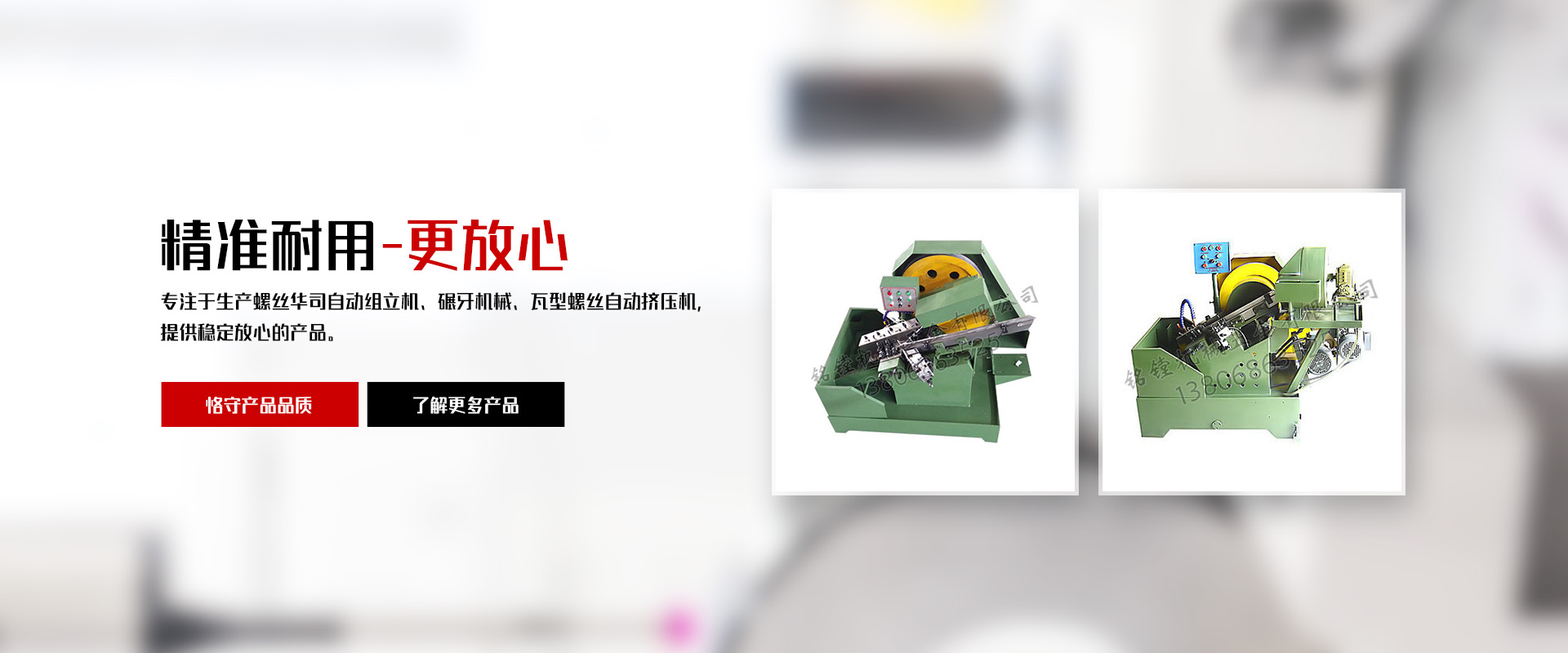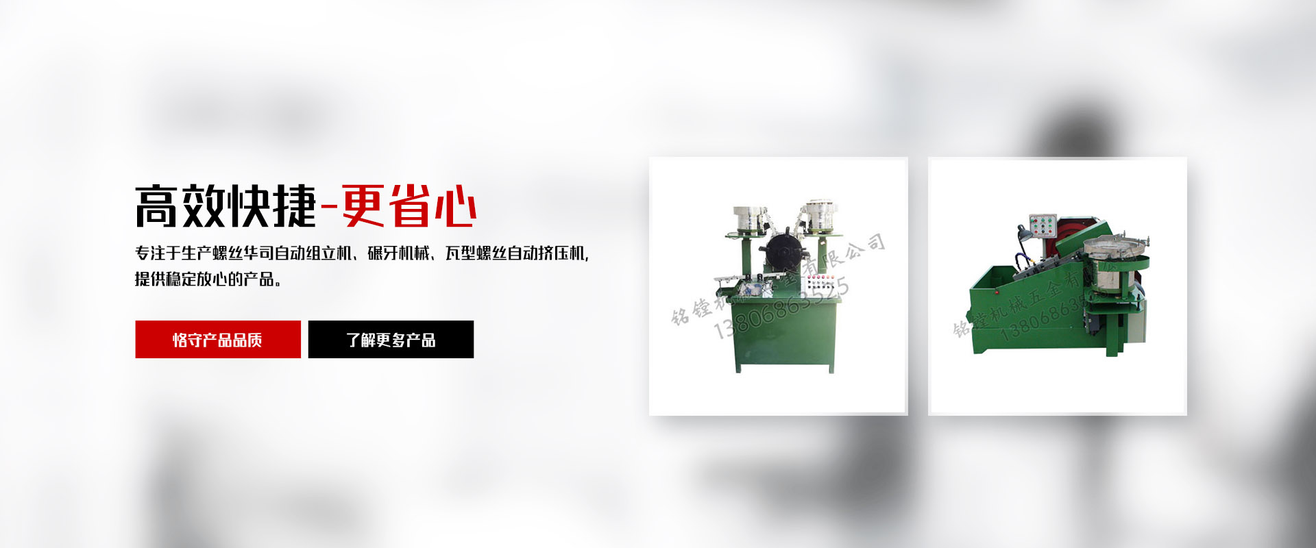 銘鏜機(jī)械五金有限公司,位于浙南地區(qū)經(jīng)濟(jì)繁榮發(fā)達(dá)的樂清白象鎮(zhèn)工業(yè)園區(qū)。公司擁有多年生產(chǎn)螺絲華司自動(dòng)組立機(jī)及碾牙機(jī)械,瓦型螺絲自動(dòng)擠壓機(jī),制造和生產(chǎn)經(jīng)驗(yàn)。公司成立至今以先進(jìn)的技術(shù)完善的科學(xué)管理、嚴(yán)格的產(chǎn)品檢測(cè)及質(zhì)量保證體系、和完善的售后服務(wù)體系;贏得廣大用戶的好評(píng)和信賴。